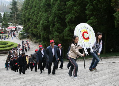 在庄严肃穆的烈士陵园,大家在烈士纪念碑前致哀、鞠躬、敬献花圈。全体党员及入党积极分子面对鲜红的党旗,高举拳头重温誓词,进行了宣誓仪式。