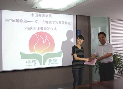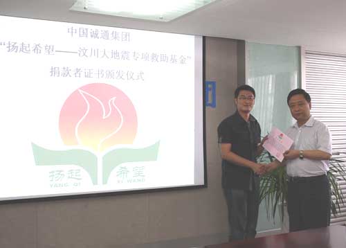 会议首先举行了为“扬起希望--汶川大地震专项救助基金”捐款颁发证书仪式,李耀强副书记向各公司捐款者代表颁发了爱心证书。
